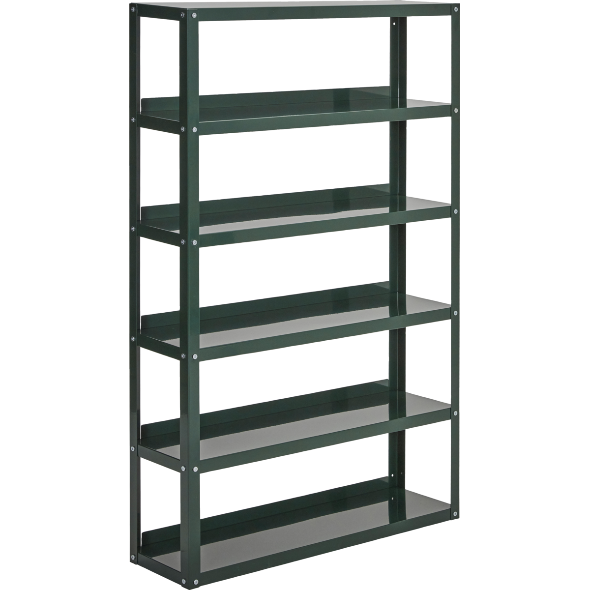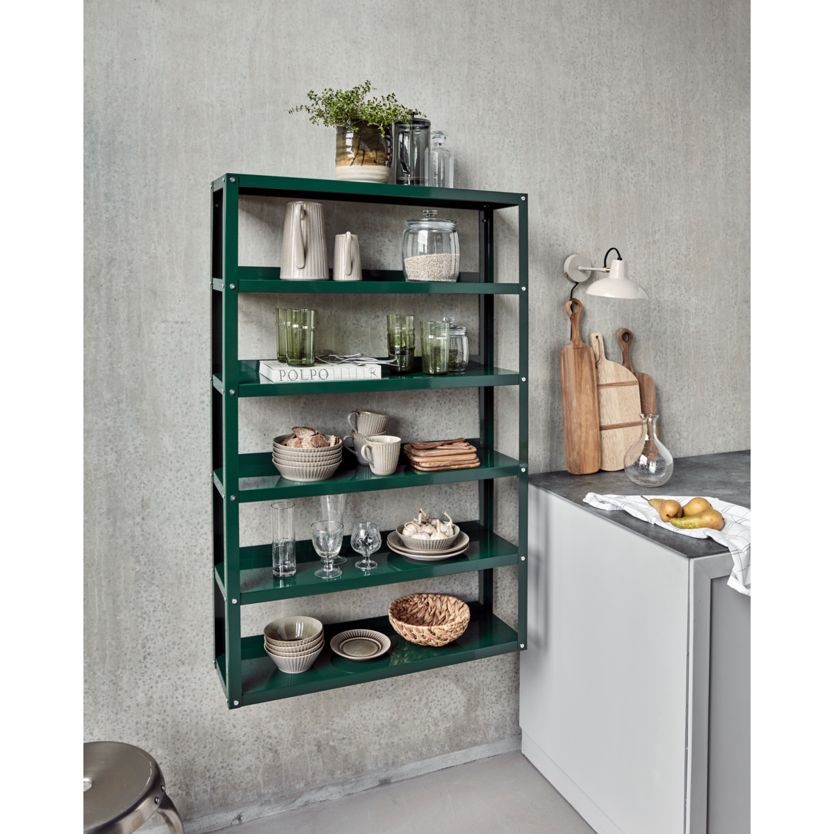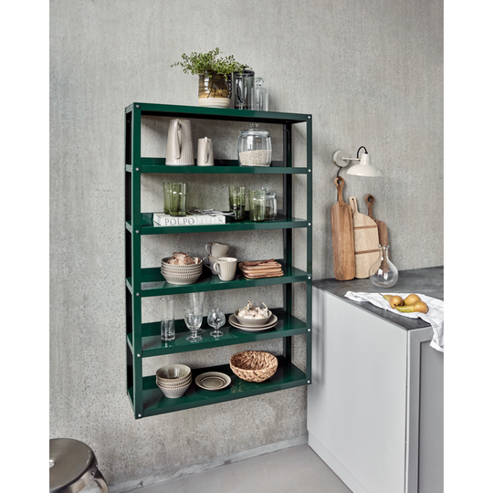 Tämä tummanvihreä hylly lisää ajattoman tyylikkyyden ja toiminnallisuuden mihin tahansa huoneeseen. Hylly on valmistettu kestävästä teräksestä kiiltävällä viimeistelyllä ja siinä on kuusi hyllyä, joista jokaisessa voi olla jopa 5 kg. Täydellinen antamaan henkilökohtainen kosketus kotiisi. Minimalistinen muotoilu sopii tyylikkäästi erilaisiin sisustustyyleihin.